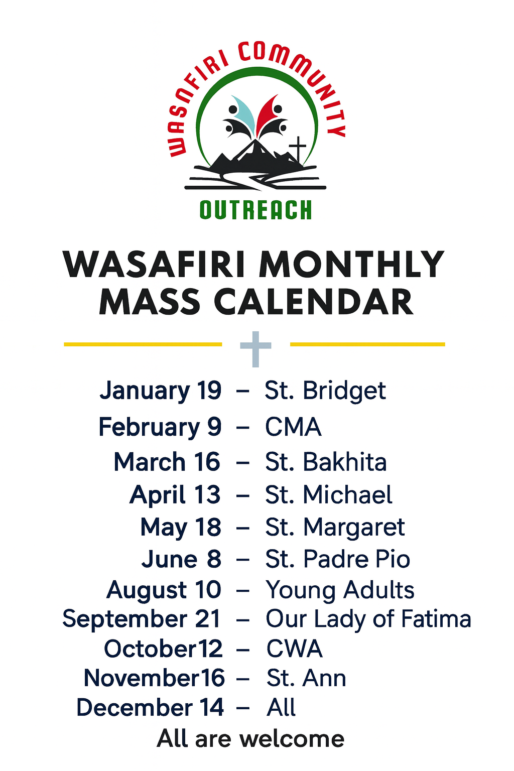 ✨ Our liturgy is enriched with Swahili hymns, African cultural expressions, and vibrant choir music that reflect the unity of our diverse community. Fellowship and hospitality follow every Mass—please stay, connect, and share a meal with us.